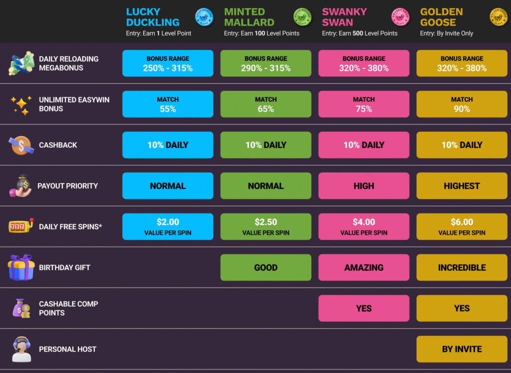 For every $20 deposited, you gain a Level Point. Secure one point to become a Lucky Duckling! As you gather more Level Points, climb the ranks* and enjoy increasing perks and bonuses!